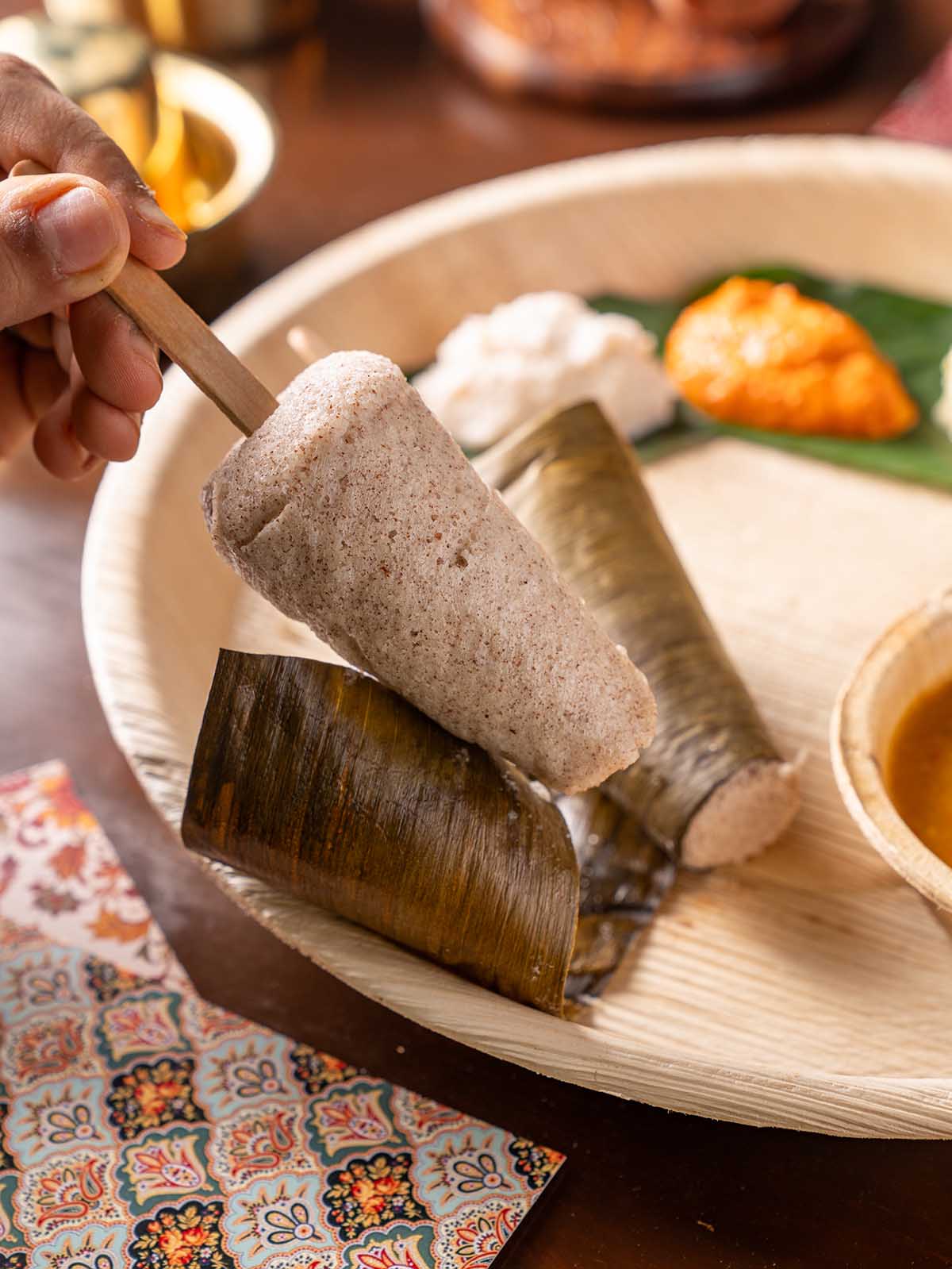 Another must have dish is the Millet Cone Idli. Made with ragi, this idli variation is presented in the shape of a popsicle. The batter is steamed while wrapped in a banana leaf, which adds a unique and subtle flavour.